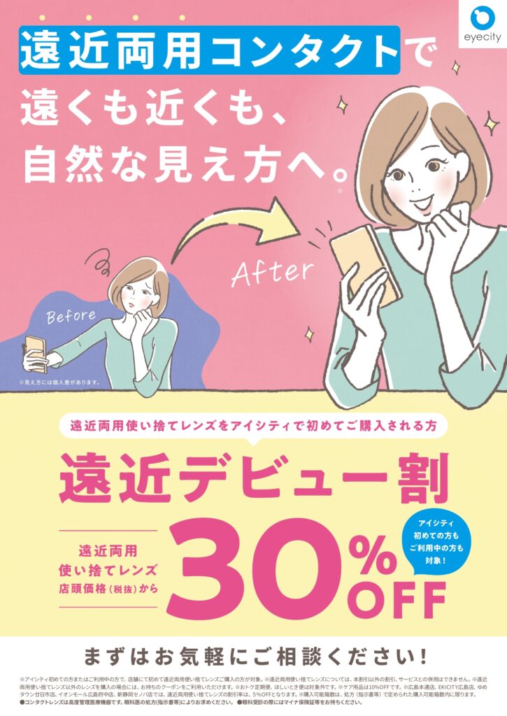 ※アイシティ初めての方またはご利用中の方で、店舗にて初めて遠近両用使い捨てレンズご購入の方が対象。