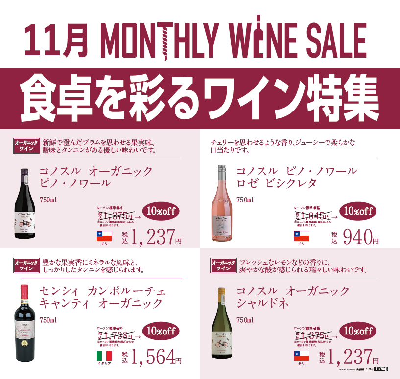 ナチュラルローソンでは、毎月、季節にぴったりのワインをセール価格でご提供しております。