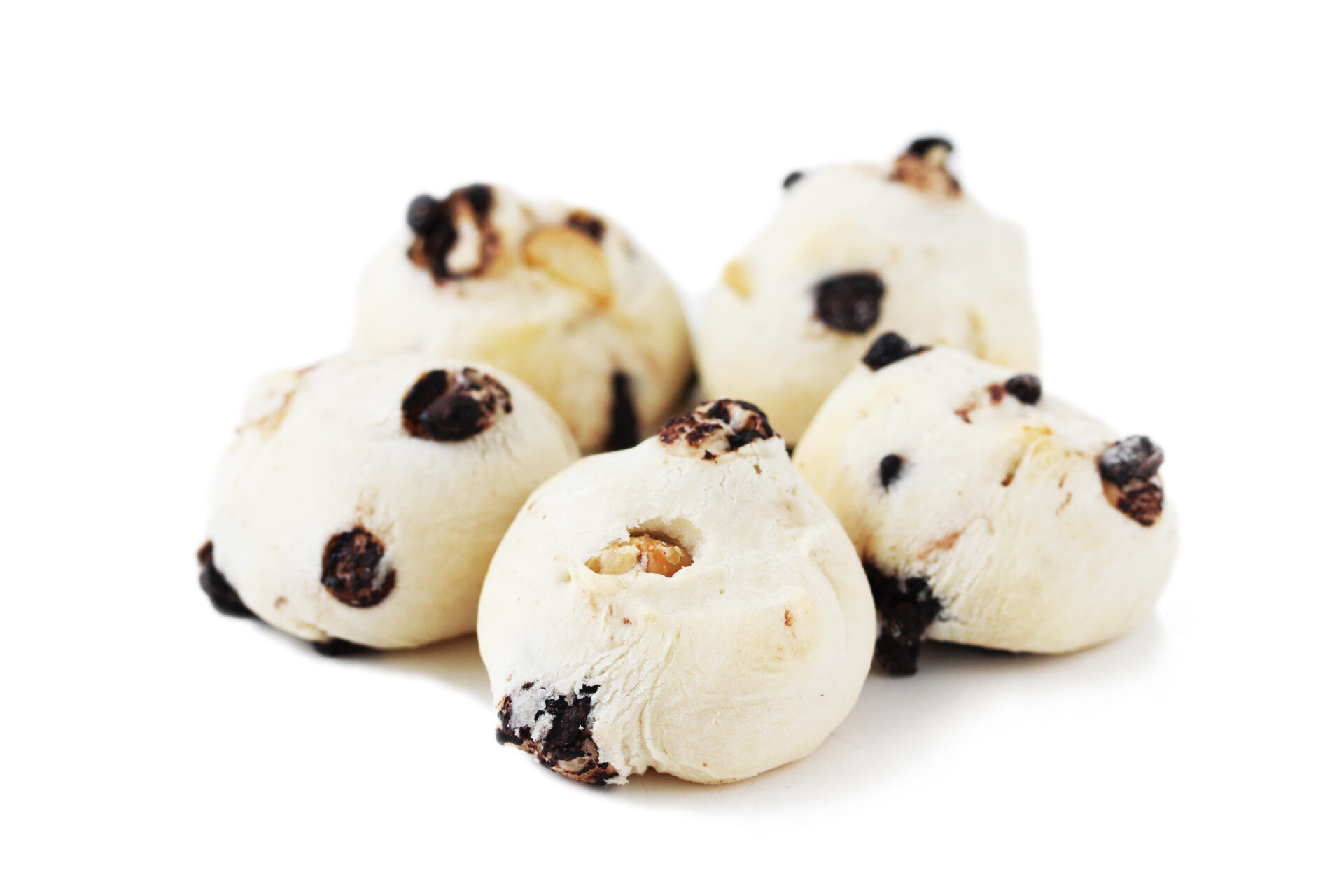 「ショコラマカダミアもち」 もちもちパンの中にチョコチップとマカダミアナッツ。 食感のちがいをお楽しみください。 100g ¥357(税込) 5~6個くらい